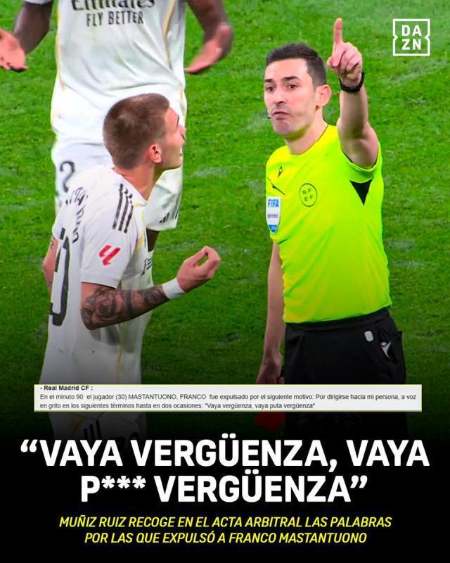 根据裁判的赛后报告,他对两三米外的主裁判穆尼斯·鲁伊斯骂了“真是耻辱,真XX的耻辱!”据西班牙足协纪律守则第124条规定:“以蔑视或不尊重的态度或言语对待裁判,只要该行为不构成更严重的违规行为,将被处以停赛2至3场或长达1个月的处罚。” 马斯坦托诺的情节很可能只会停赛2场,错过3月6日作客塞尔塔和3月14日主场对埃尔切的比赛。